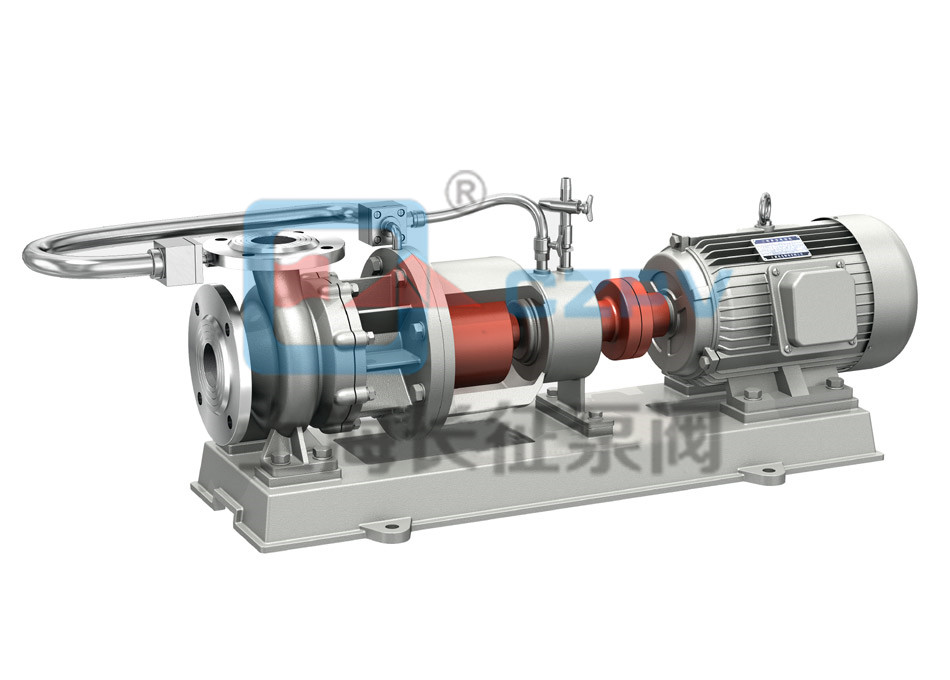 NGCQ型高溫磁力驅(qū)動(dòng)離心泵(簡(jiǎn)稱(chēng)高溫磁力泵)通常由電機(jī),磁力偶合器,水冷卻裝置和耐腐蝕離心泵四大部分組成,其主要特點(diǎn)是利用磁力偶合器傳遞動(dòng)力。當(dāng)電動(dòng)機(jī)帶動(dòng)磁力偶合器的外磁鋼旋轉(zhuǎn)時(shí),磁力線穿過(guò)間隙和隔離套,作用于內(nèi)磁鋼上,使泵轉(zhuǎn)子與電動(dòng)機(jī)同步旋轉(zhuǎn),無(wú)機(jī)械接觸地傳遞扭矩。在泵的動(dòng)力輸入端,由于液體被封閉在靜止的隔離套內(nèi),沒(méi)有動(dòng)密封因而無(wú)泄漏。磁力偶合器的磁性材料采用耐高溫型稀土永磁材料,能承受280度以下的高溫介質(zhì)而保持強(qiáng)大的磁力扭矩。在電機(jī)與磁力偶合器之間加裝了水冷卻裝置,防止泵送高溫介質(zhì)之熱量傳導(dǎo)至電機(jī),以保持電機(jī)的正常運(yùn)行,從而達(dá)到無(wú)泄漏輸送高溫介質(zhì)。